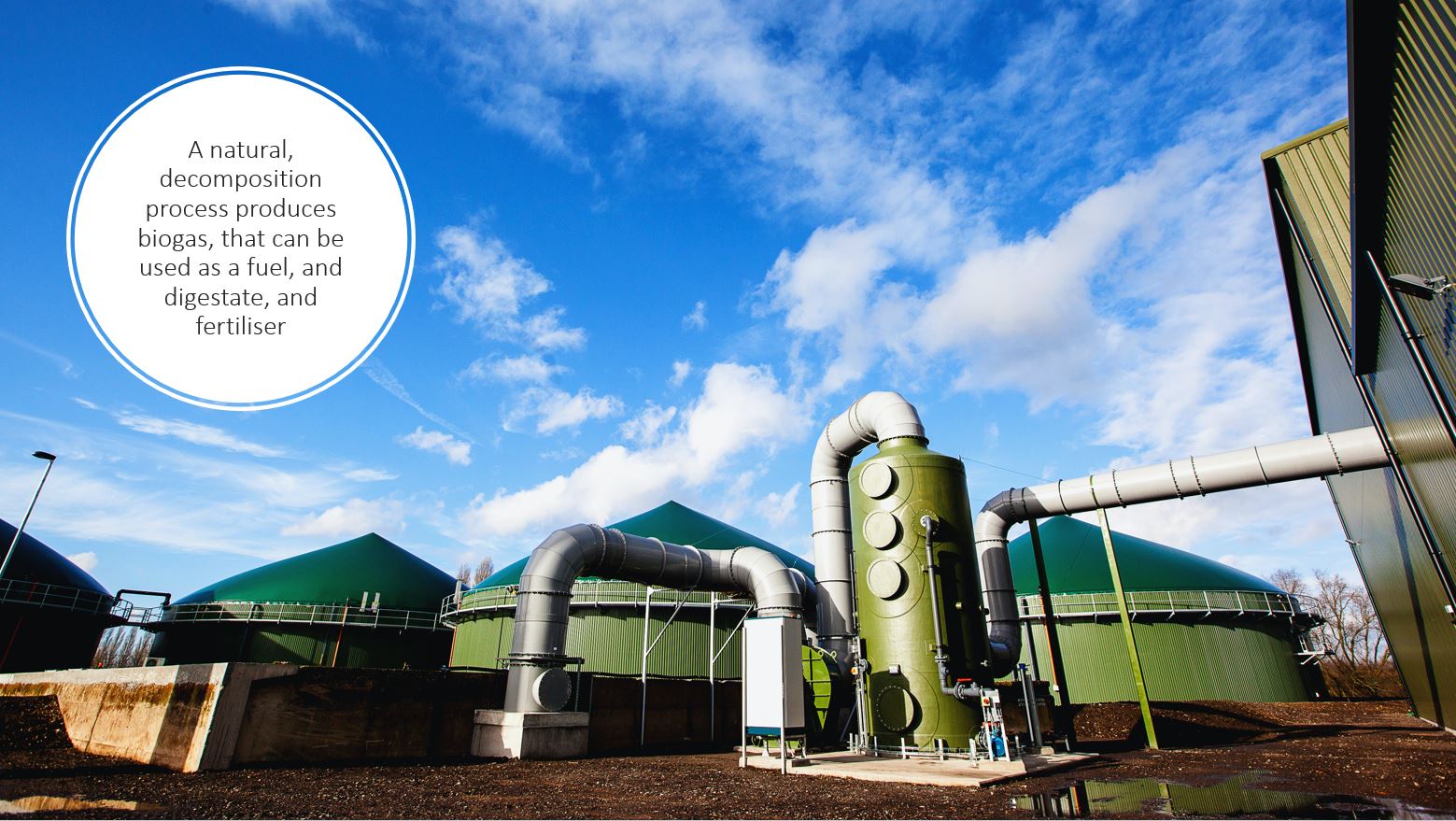 Anaerobic Digestion (AD) is a natural, decomposition process. Through this process, biomass (organic material that comes from plants and animals) is converted into a variety of resources under oxygen free conditions. AD produces biogas, a methane rich gas that can be used as a fuel, and digestate, a source of nutrients that can be used as a fertiliser.