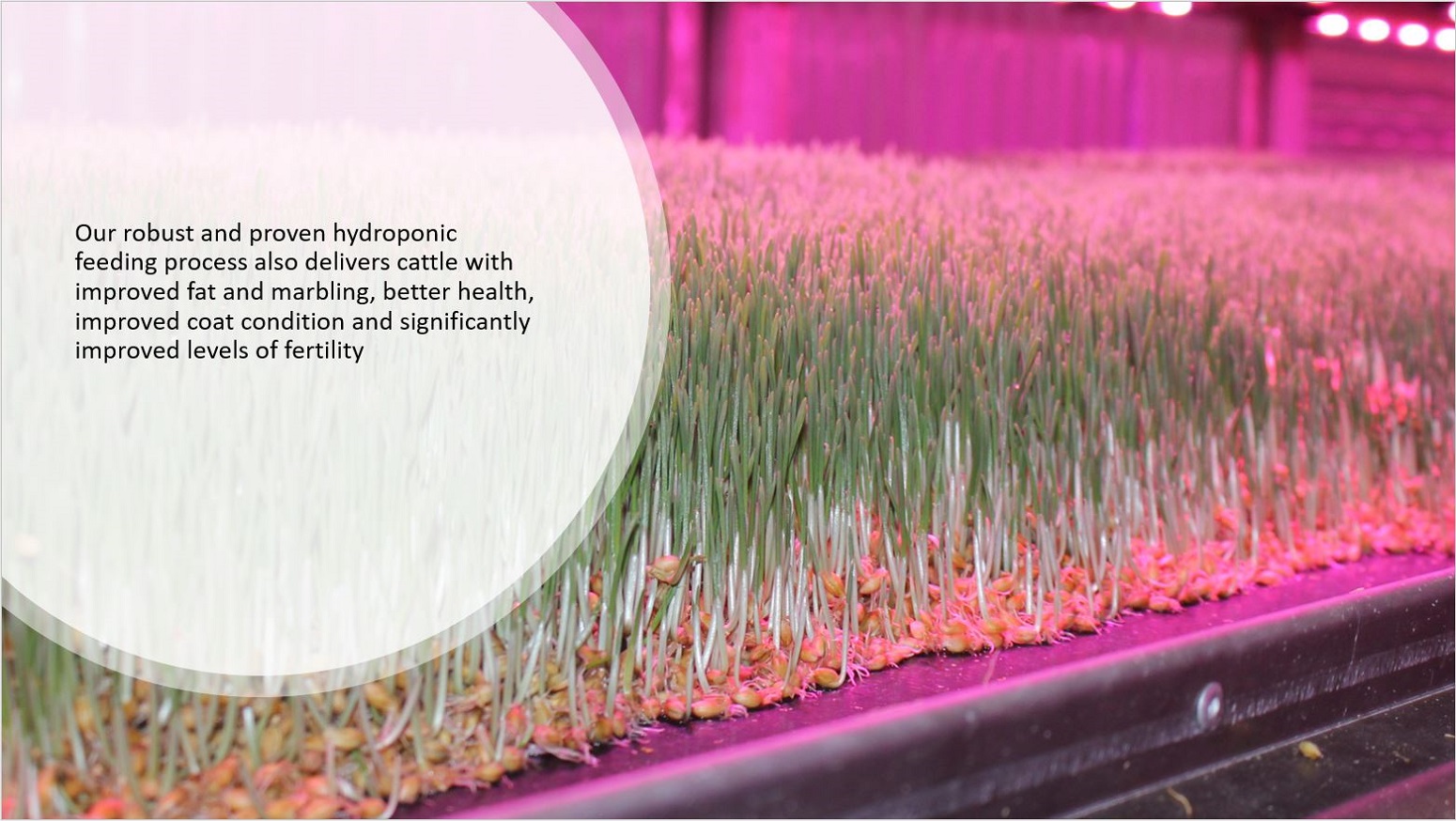 Our robust and proven hydroponic feeding process also delivers cattle with improved fat and marbling, better health, improved coat condition and significantly improved levels of fertility.