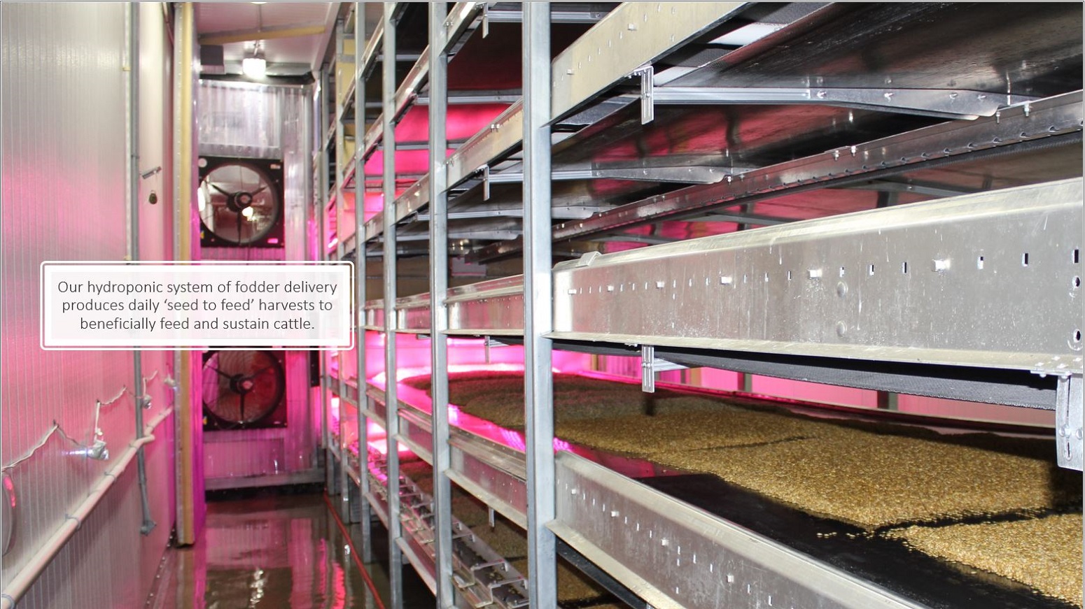 Our hydroponic system of fodder delivery produces daily ‘seed to feed’ harvests to beneficially feed and sustain cattle.